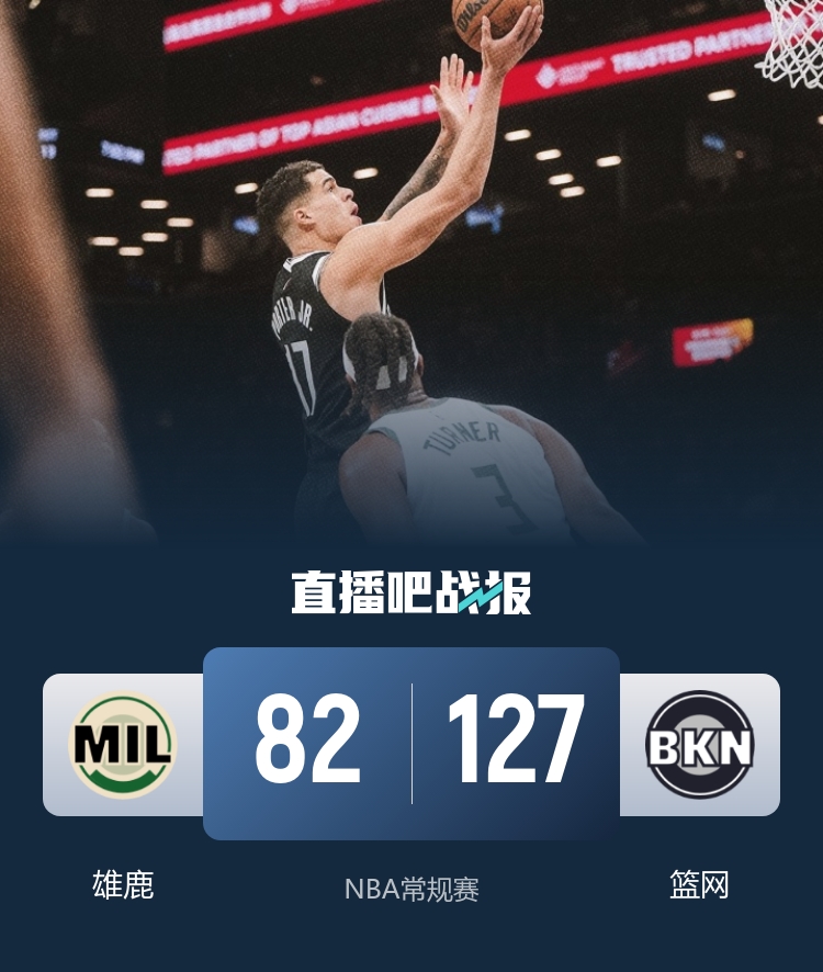 比赛开始,小凯文·波特连续抢断,库兹马接连冲击内线,但篮网全民皆兵回应,末段扎威和夏普替补上来打得很主动,篮网首节领先12分,次节雄鹿连续失误,篮网反击8-2扩大领先,但库兹马上来带队7-0止血,半场篮网依旧领先17分。下半场,克洛尼外线开和连中4记三分拉开20分以上领先,特伦特连续三分单节上双苦苦支撑,末节双方基本派上替补练兵,篮网继续发力拉开30分以上领先,最终篮网127-82大胜雄鹿。