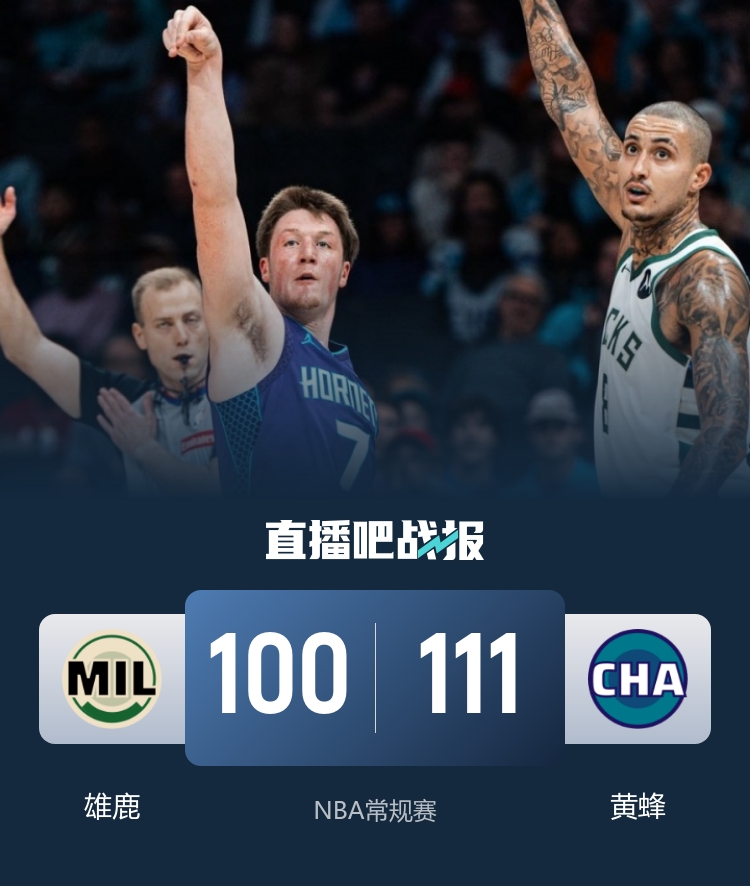 一开场,卡尔克布伦纳攻防两端高效发挥,雄鹿内外开花迅速回应,迈尔斯·布里奇斯三分命中,引领黄蜂12-3的攻击波取得领先,康诺顿连中三分颜射旧主,特纳外线开炮且连送封盖,帮助雄鹿缩小分差,罗林斯里突外投,半场战罢黄蜂59-50领先雄鹿。下半场,黄蜂率先发力,轮番冲击内线得手一度领先到19分,罗林斯挺身而出连中三分止血,末节黄蜂持续发力将分差拉开到20分以上,雄鹿大势已去无力回天。最终,黄蜂111-100轻取雄鹿,主场过关。