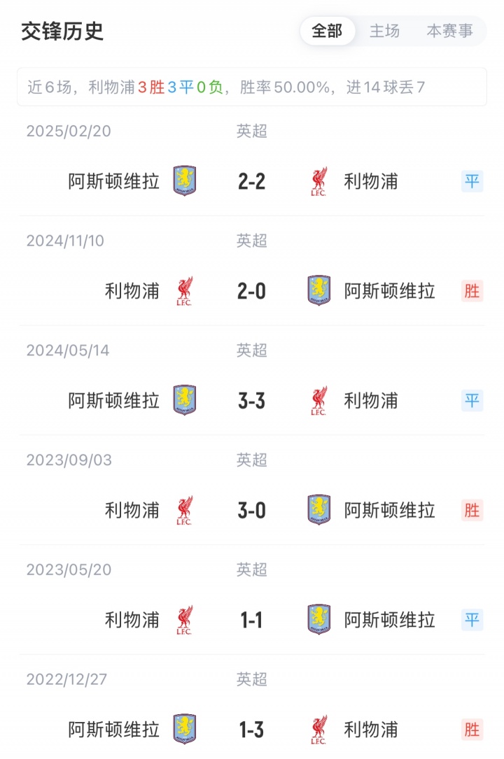 利物浦联赛5胜4负积15分,近4轮遭遇4连败;维拉联赛4胜3平2负积15分,目前联赛4连胜。利物浦对阵维拉已连续10场不败(7胜3平)。