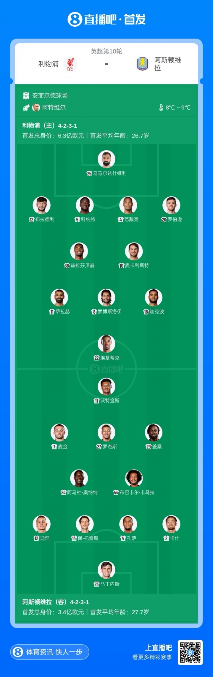 利物浦vs维拉首发:萨拉赫、埃基蒂克、罗杰斯先发,维尔茨替补